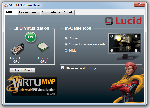 Для того чтобы воспользоваться Intel QSV, в настройках BIOS следует активировать встроенное графическое ядро процессора и назначить на него вывод изображения. После этого с сайта Gigabyte или Lucidlogix скачивается утилита Virtu MVP. По умолчанию программа содержит огромный список приложений, для которых уже задано использование интергрированного или внешнего видеоадаптера. Среди них оказалась и задействованная в тесте утилита ArcSoft MediaConverter 8, то есть никаких дополнительных настроек не потребовалось. Для наглядности эксперимента осуществлялся мониторинг загрузки модуля транскодирования. Это легко реализуется при помощи фирменной утилиты Media Performance, входящей в состав Intel Graphics Performance Analyzers.