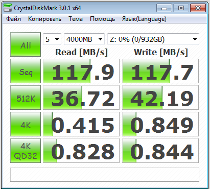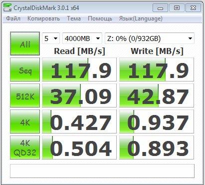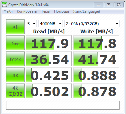 Результаты теста накопителя при подключении через USB 3.0 (PCH Z77)