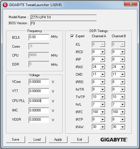Программа Gigabyte Tweak Launcher оказалась полностью неработоспособной: частоты не отображались и не изменялись ручным вводом, а при попытках поменять задержки работы памяти приложение завершалось с ошибкой.