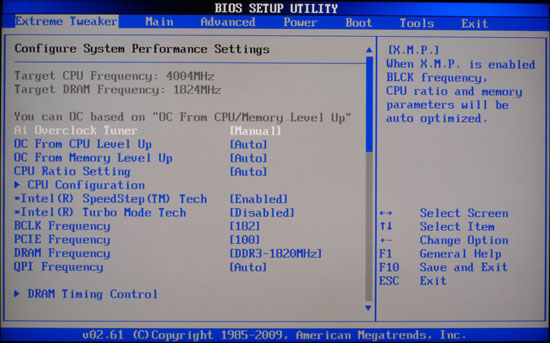 Всего в BIOS насчитывается шесть основных разделов. Первый из них, под названием Extreme Tweaker, позволяет, соответственно названию, полностью настроить производительность компьютера. Здесь есть возможность как изменения частоты BCLK, при помощи увеличения которой большинство пользователей и будет осуществлять разгон процессора, так и процессорного множителя, если, конечно, процессор позволяет. Вместе с ними можно настроить частоту памяти, частоту шины QPI, включить или выключить различные функции процессоров Intel, такие как Turbo Boost или Speed Step.