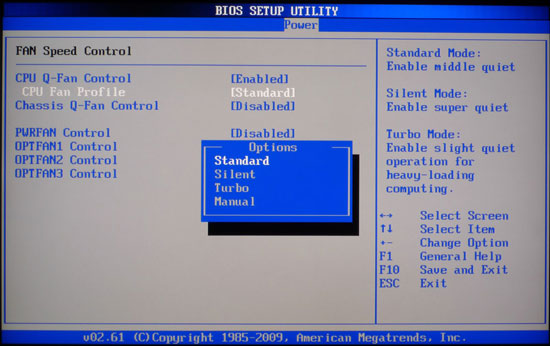 Пункт "FAN Speed Control" позволяет управлять режимами работы вентиляторов, если установить значение напротив нужных вентиляторов в положение "Enabled". Для каждого вентилятора существует четыре режима: стандартный, тихий, режим высоких оборотов или ручной, в котором скорость вращения вентилятора можно установить самостоятельно.