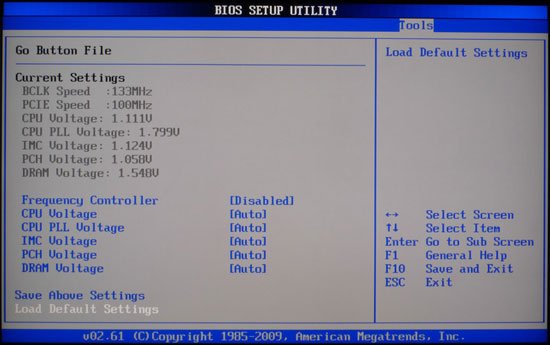 Остановимся чуть подробнее на настройках кнопки "Go Button". Для того чтобы при работе иметь возможность переключаться между профилями BIOS при помощи одной кнопки, в соответствующих полях настроек надо прописать напряжения и частоты, которые будут установлены при нажатии "Go Button". Повторное нажатие вернет систему к исходным значениям.