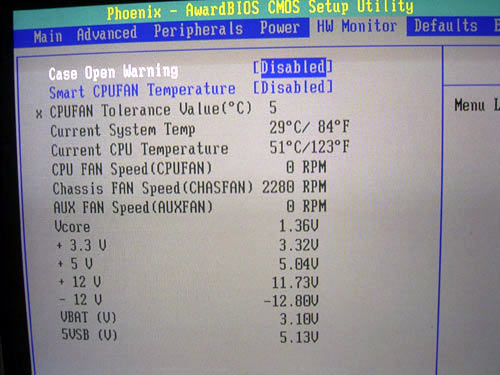 Набор функций стандартный - отслеживаются скорости вращения трех вентиляторов, температуры процессора и системы, а так же текущие уровни напряжений. Кроме того, доступна функция Smart FAN, которая позволяет изменять скорость вентилятора в зависимости от тем-ры процессора.
