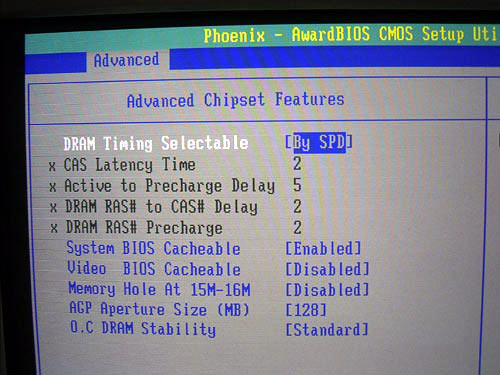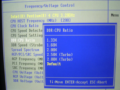 Как мы видим пользователю предоставляются понижающие делители 23 и 45, делитель синхронного режима 11, а также повышающий делитель 54. Кроме того, в списке присутствует режим 11 "Turbo", но к большому сожалению, он не активизирует режим PAT, а всего лишь пытается понизить тайминги памяти. В результате, когда мы попробовали включить режим "Turbo" с памятью Kingston HyperX PC2700, то система не стартовала. В обычном синхронном режиме, эта память работала безупречно. Также плата показала очень хорошую совместимость с модулями Geil DDR550 (250Мгерц) и OCZ DDR400 (225Мгерц).