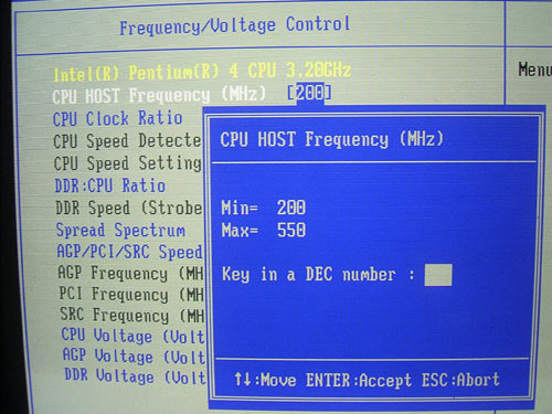 Вначале смотрим на диапазон изменения частоты системной шины (FSB), который находится в пределах от 200(133) до 550Мгерц. При этом шаг изменения = 1Мгерц; также есть возможность задать нужное значение с клавиатуры, не открывая дополнительное окно.