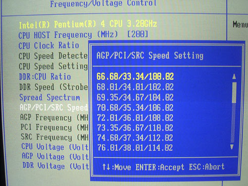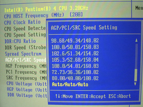 При работе на повышенных частотах очень важно, чтобы частоты шин PCI и AGP, по возможности, не отклонялись от стандартных 33 и 66Мгерц, соответственно. Прежде всего это важно для корректной работы жестких дисков. Так вот, плата Albatron PX865PE7 Pro имеет возможность установки фиксированной частоты на шинах PCI и AGP. Данный параметр варьируется с 33/66 до 108/54 Мгерц, соответственно.
