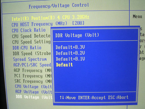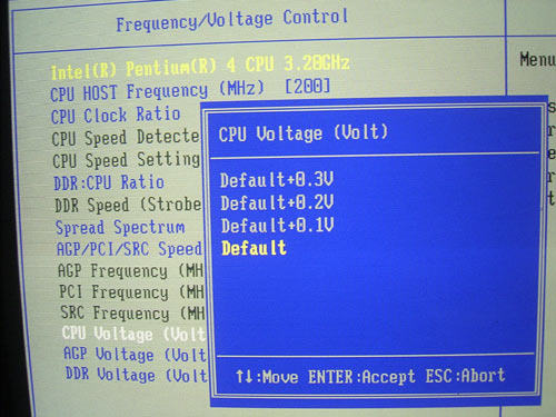 Следующий по важности пункт - изменение напряжения на процессоре(Vcore). Данная функция реализована очень грубо: всего три возможных значения (максимальное +0.3V).