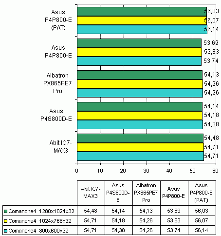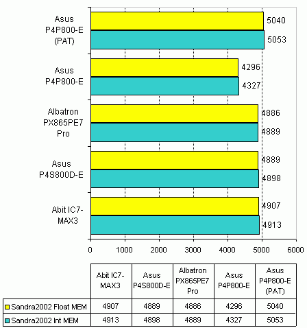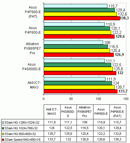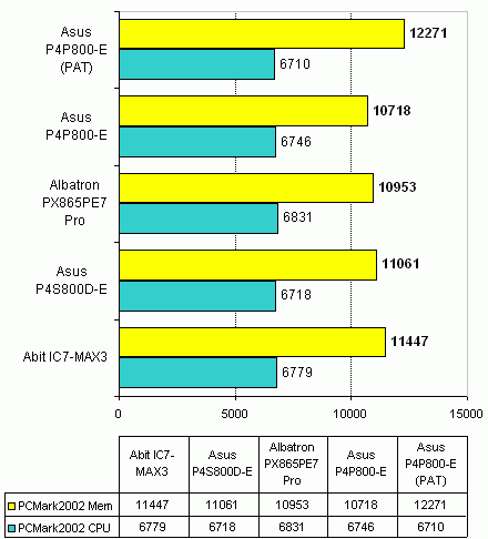 Нетрудно заметить, что плата Albatron PX865PE7 Pro показывает довольно высокий уровень производительности, сравнимый с многими платами на i865PEi875P. Но вот без активации функции PAT, она не может дотянутся до лидера - Asus P4P800-E + PAT. Впрочем, мы тестировали плату со стартовой версией биоса, и вполне возможно, функция PAT появится в следующих версиях (тем более что инженеры Albatron уже реализовали PAT на платах 865PE + Socket 478).