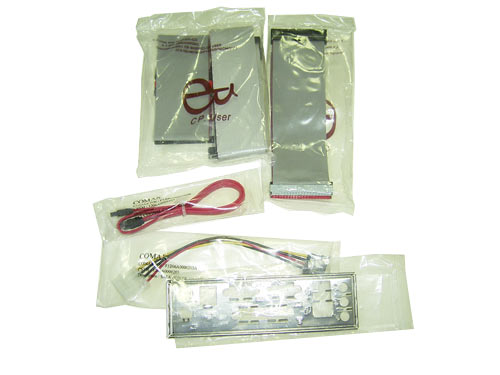 Остальная комплектация стандартная: заглушка на заднюю панель, наклейка со схемой-расположением джамперов. Также в комплекте есть один SerialATA кабель с соответствующим переходником питания, а также IDEFDD шлейфы.