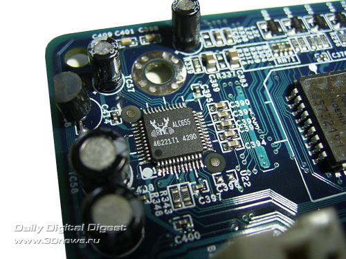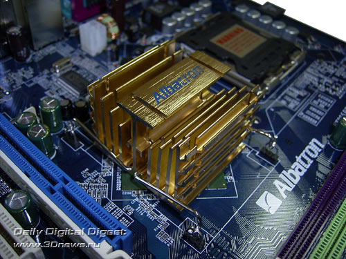 Между процессорным сокетом и AGP слотом установлен северный мост, который охлаждается довольно крупным радиатором.