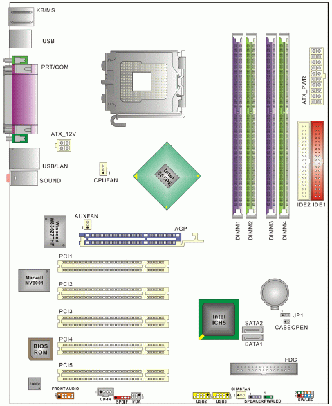 В целом дизайн платы довольно удачный: основной разъем питания установлен на нижнем краю платы, а защелки слотов DIMM не блокируются AGP-видеокартой. Да, да вы не ослышались - поскольку плата основана на чипсете i865PE, то на ней установлен AGP слот. Это позволяет использовать уже имеющуюся видеокарту, и не покупать дорогие (и пока еще редкие) платы PCI Express.