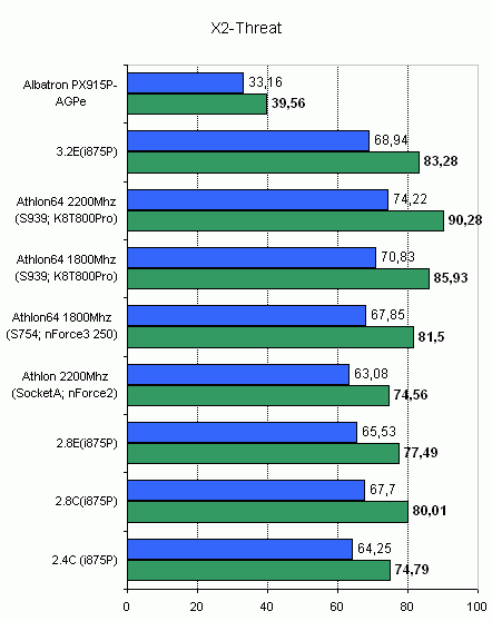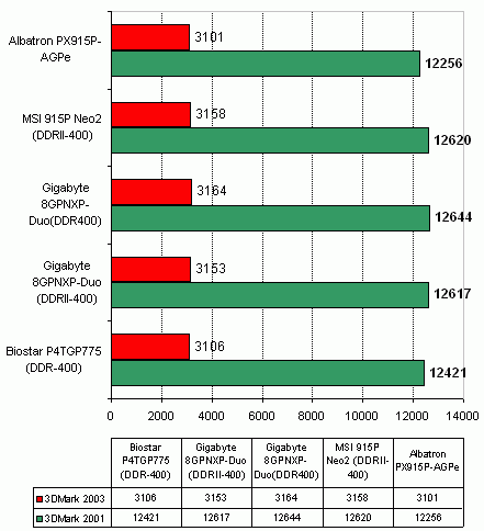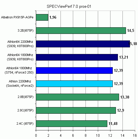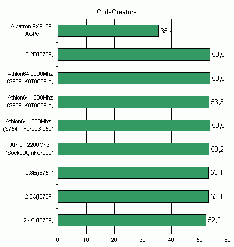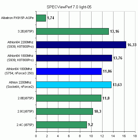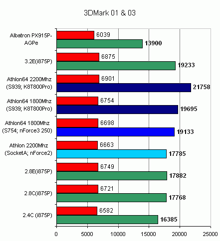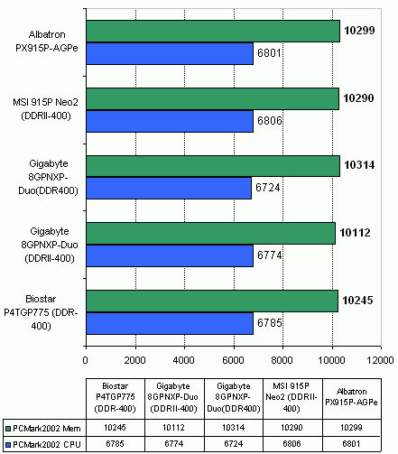 Мы провели две серии тестов производительности: одну с PCI Express видеокартой (это nVidia GeForce FX 5750); вторую - с AGP видеокартой (ATI 9800XT). Понятно, что с PCI Express картой неожиданности маловероятны - производительность будет приблизительно на уровне остальных плат на i915Pi925X. А вот с AGP видеокартой ситуация совсем другая: дело в том, что как таковой поддержки шины AGP у чипсета i915P нет. Поэтому инженерам Albatron прошлось эмулировать AGP с помощью шины PCI. И естественно это приведет к падению производительности подавляющего большинства 3D-приложений. И именно этот момент нас особенно интересует - насколько велико падение производительности (и не проще ли купить low-end карту на шине PCI Express).