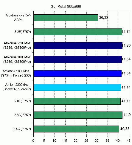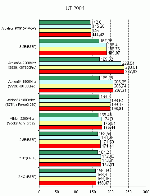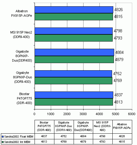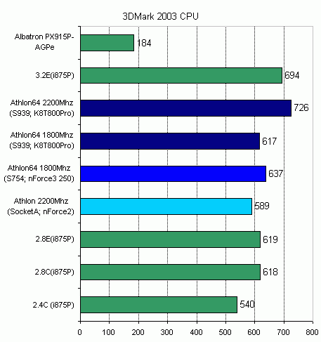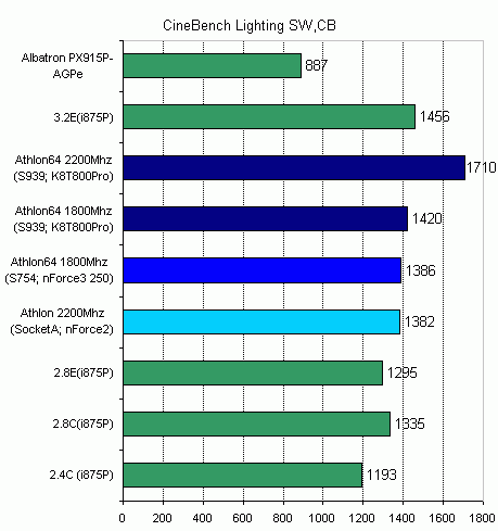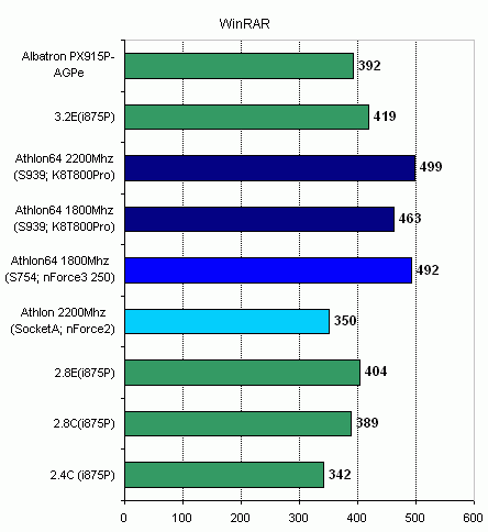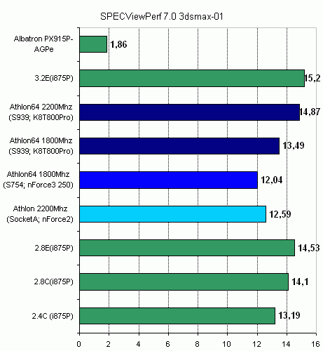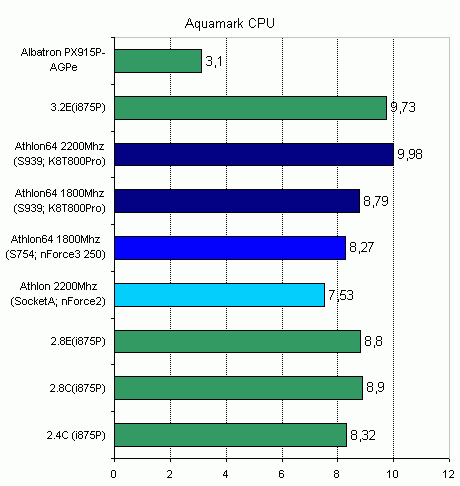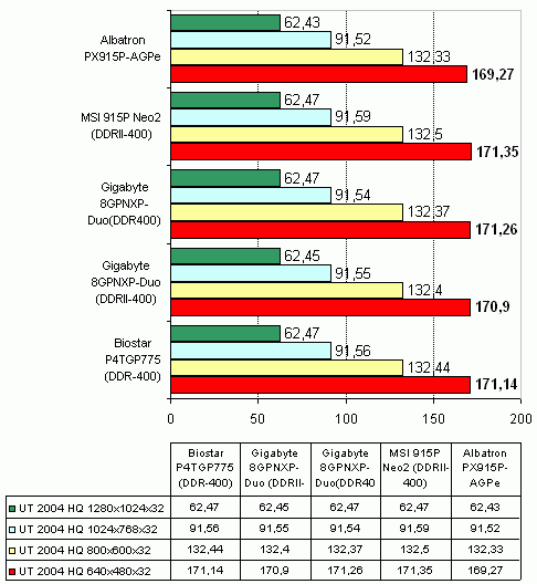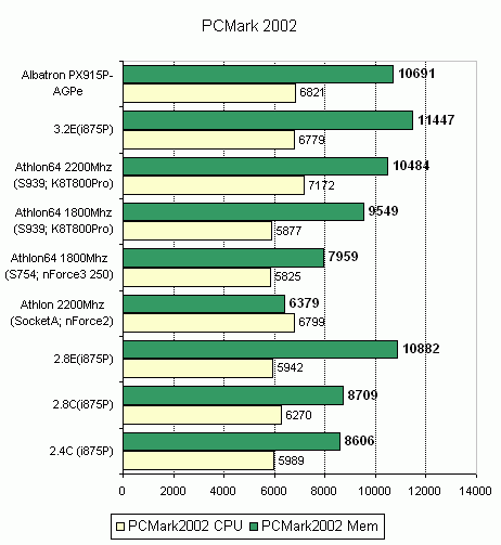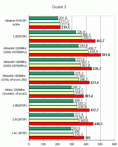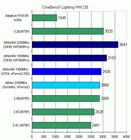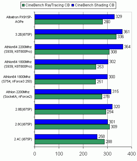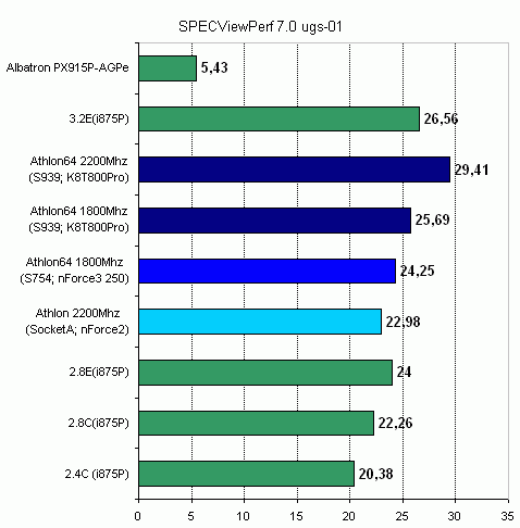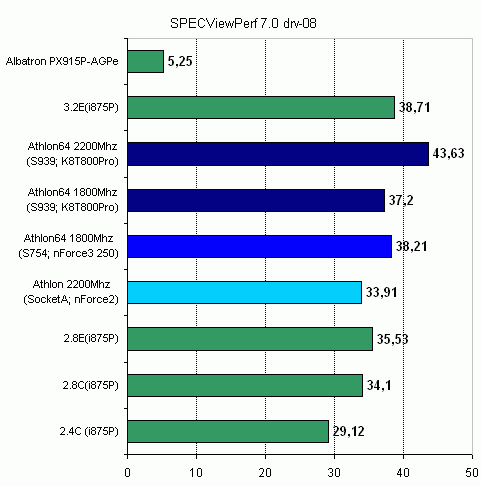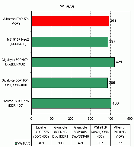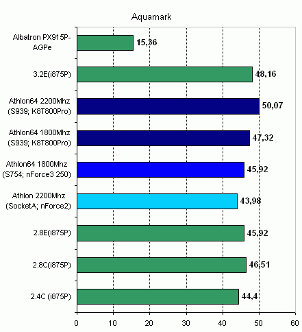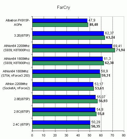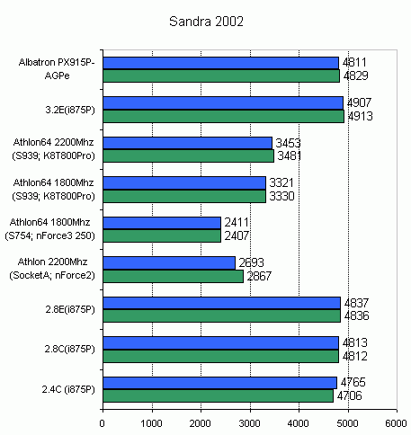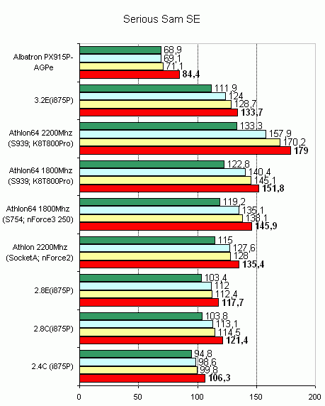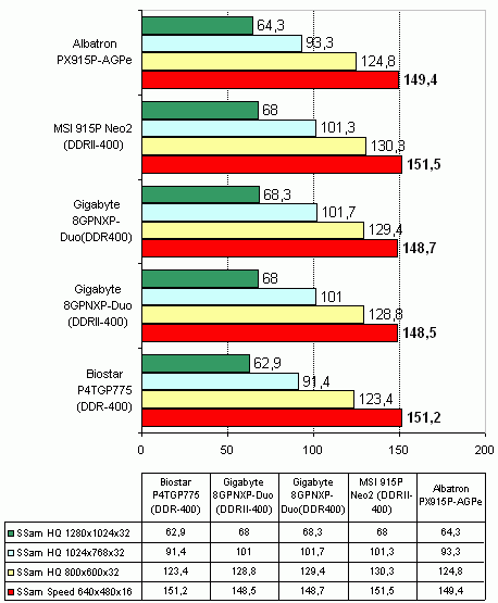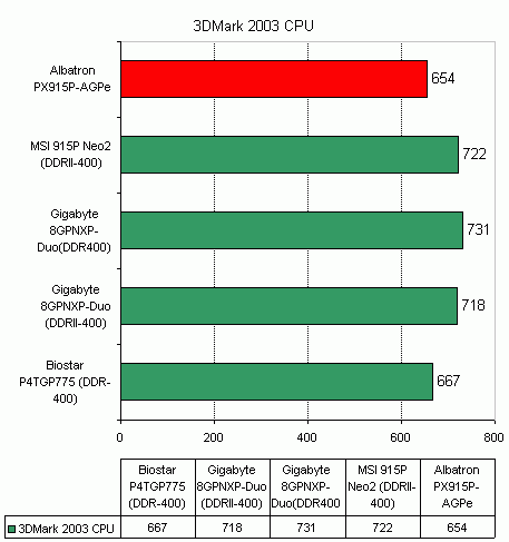 А сейчас посмотрим на производительность платы Albatron PX915P-AGPe с установленной AGP видеокартой. Для оценки падения производительности я привел данные скорости еще нескольких платформ с процессорами Intel и AMD. Ну а тем читателям, кто не хочет утруждать себя многочисленными цифрами, советую сравнивать скорости только первых двух систем.