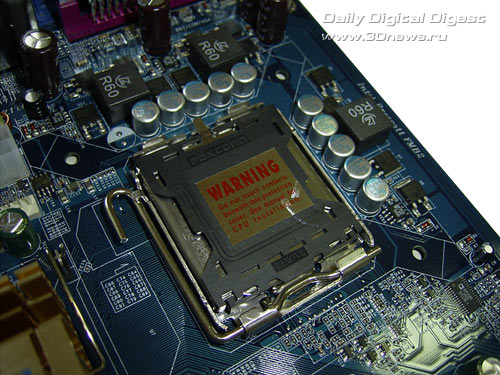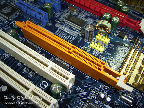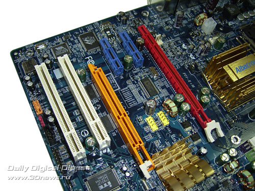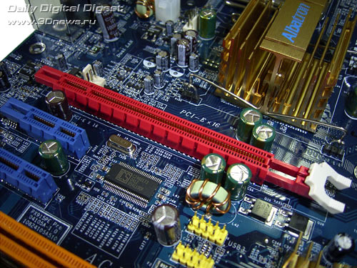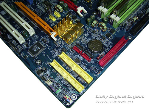 В целом дизайн платы довольно удачный: основной разъем питания установлен на нижнем краю платы, а защелки слотов DIMM расположены далеко от слота PCI Express x16 (и тем более от AGP слота).
