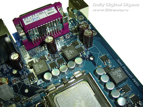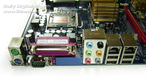 Также благодаря ICH6 плата поддерживает 8 портов USB2.0, из которых 4 расположены на задней панели, а еще 4 подключаются при помощи брекета (есть в комплекте). И наконец, ICH6 поддерживает 8 канальный звук Intel High Definition Audio, а в качестве кодека используется чип ACL880.