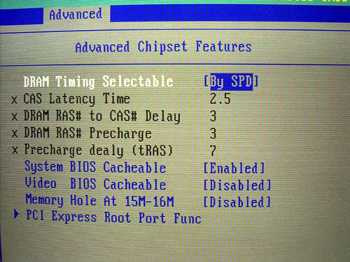 Раздел настроек памяти позволяет изменять стандартный набор таймингов ("CAS Latency", "Precharge to Active"(Trp), "Active to precharge" (Tras) и "Active to CMD"(Trcd)).