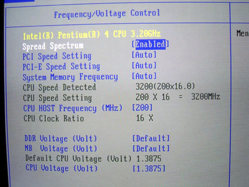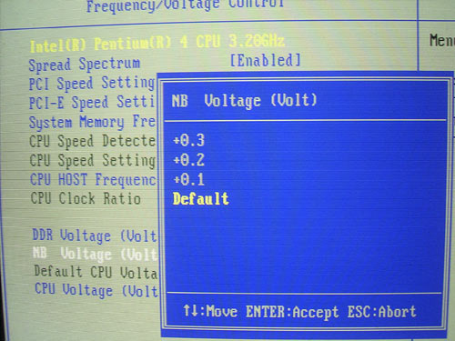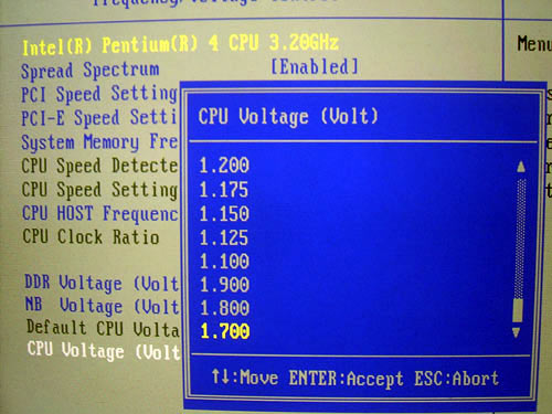 Во-вторых, плата Albatron PX915P-AGPe позволяет изменять напряжение на процессоре(Vcore) в очень широком диапазоне: от 0.85V до 1.6V с шагом 0.025V. И от 1.6V до 1.9V с шагом 0.1V.