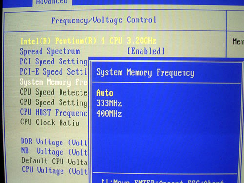 Пользователю доступны следующие делители частоты памяти 1:1(DDR400) и 5:6 (DDR333). Что касается совместимости с оперативной памятью, то плате Albatron PX915P-AGPe похвастаться нечем. В частности она отказалась стартовать с памятью Kingston HyperX PC2700, которая довольно популярна благодаря очень низким таймингам. С другой памятью (OCZ PC3200 и Geil PC4400) плата работала без проблем.
