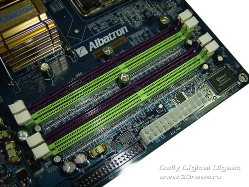 Под северным мостом установлено четыре 184-пиновых слота DIMM для модулей памяти DDR-I. Они разбиты на две группы по два слота. Первые два слота относятся к первому каналу контроллера, последние два - ко второму каналу.