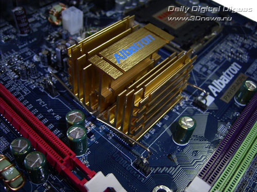 Специально подчеркнем отличные результаты в области разгона. Так с AGP видеокартой плата установила абсолютный рекорд по разгону (P4 3.2 => 4.1Ггерц; FSB=256Мгерц), а с PCI Express картой результаты также были на высоком уровне (FSB=246Мгерц). Правда, охлаждение чипсета сделано пассивным образом (как на подавляющем большинстве другие карт), и для дальнейшего разгона необходимо добавить вентилятор.
