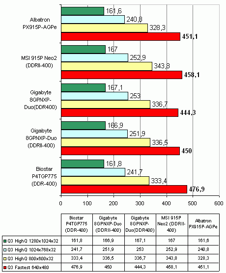 Как мы видим падение производительности довольно существенно, однако скорости работы связки (i915+AGP) вполне хватает для комфортной игры в большинстве приложений. Правда для этого AGP видеокарта должна быть довольно мощнойдорогой. Если же, в наличии есть AGP видеокарта классом ниже, чем Radeon 9700, то ее производительность на системе с i915P будет приблизительно на уровне low-end карт PCI Express.