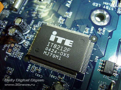 Далее - на плате установлен двухканальный ParallelATARAID контроллер ITE8212F, к которому можно подключить 4 диска, и объединить их в RAID массивы уровня RAID0, RAID1, RAID0+1 и JBOD.