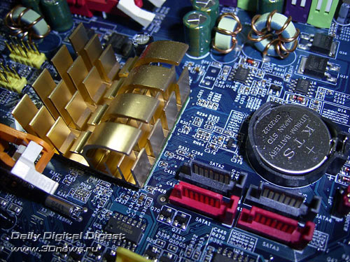 Рядом расположен 3-пиновый разъем (AUXFAN), который можно (а при разгоне - даже нужно) задействовать для охлаждения северного моста. И наконец, в левом нижнем углу платы установлен разъем CHASFAN (итого - 3 разъема).