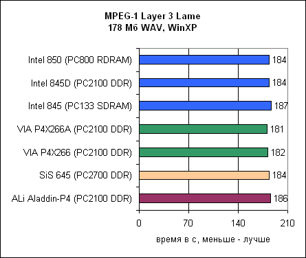 Мы кодировали 178 Мб звуковой WAV файл в MPEG-1 Layer 3 формат с помощью Lame MP3 Encoder. Как ясно показывают результаты, ALi Aladdin находится на последнем месте среди DDR чипсетов. Единственный чипсет, оставшийся позади – Intel 845 с SDRAM.