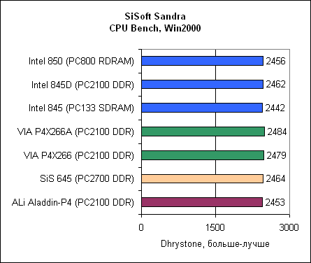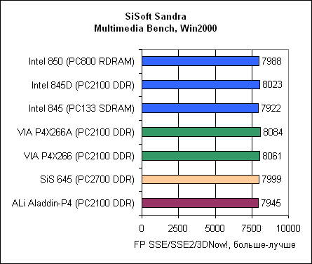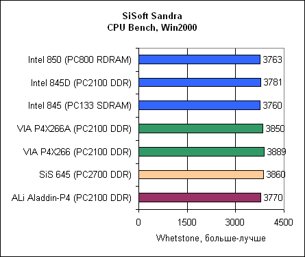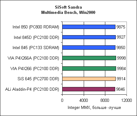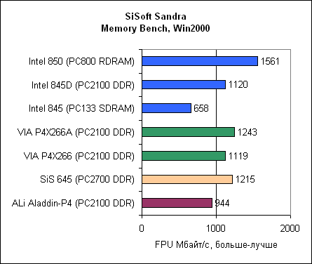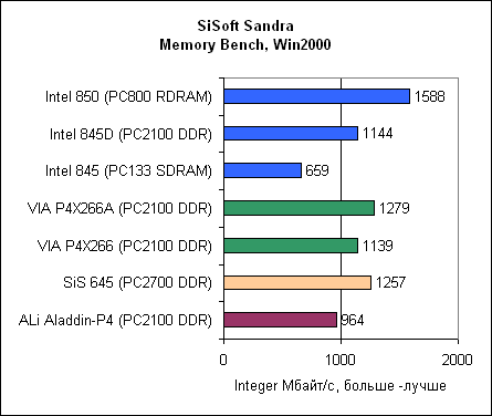 Посмотрите, насколько у ALi Aladdin-P4 низкая производительность памяти. Впрочем, не воспринимайте эти результаты слишком серьезно, поскольку SiSoft Sandra – синтетический тест.