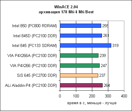 Архивация – довольно жизненное применение. Мы использовали WinACE 2.04 для архивации 178 Мб WAV файла. Здесь ALi Aladdin-P4 находится на последнем месте среди DDR чипсетов.