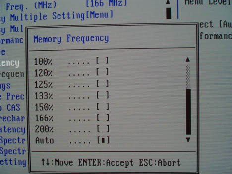 Итак, измерение производительности происходило в самом жестком для платы режиме. Частота FSB = 166Мгерц; частота памяти = 166Мгерц, при этом были установлены следующие тайминги работы: