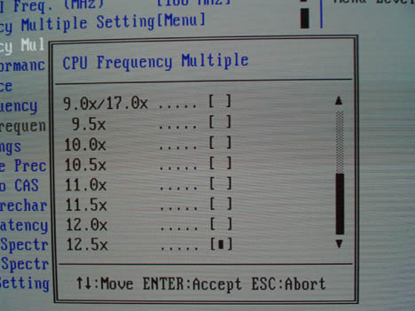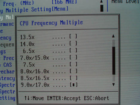 Далее - помимо изменения частоты процессорной шины мы можем изменить множитель. Диапазон изменения от 5 до 17.