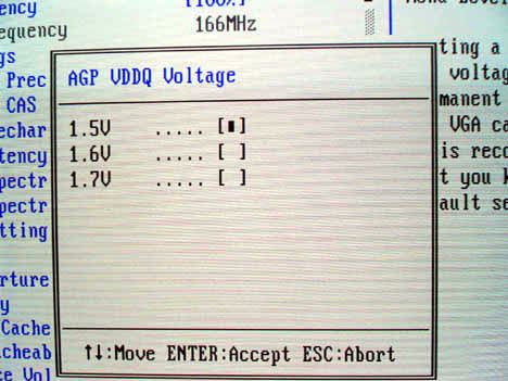 Кроме повышения напряжения на процессоре мы можем увеличить напряжение на памяти и шине AGP.