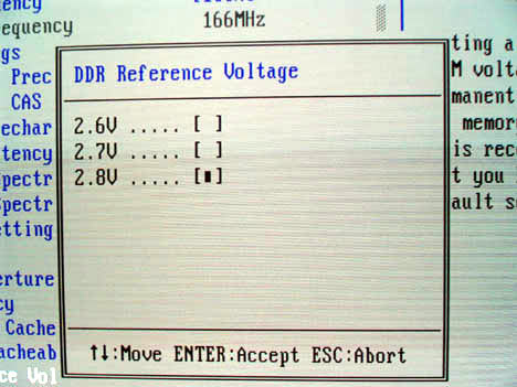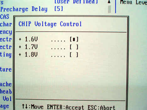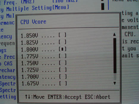 А вот нижняя граница определяется исключительно процессором. При использовании Thoroughbred-A она равна 1.5V, при установке Thoroughbred-B и Barton - 1.6-1.65V. К сожалению мы не можем принудительно установить значение 1.1V. Иногда это бывает необходимо при использовании пассивных систем охлаждения.