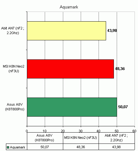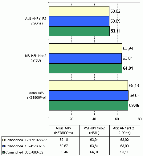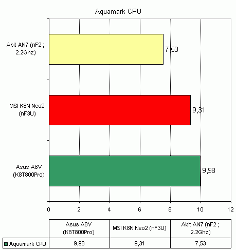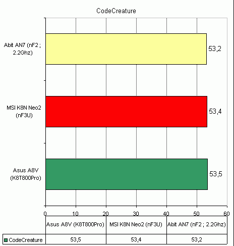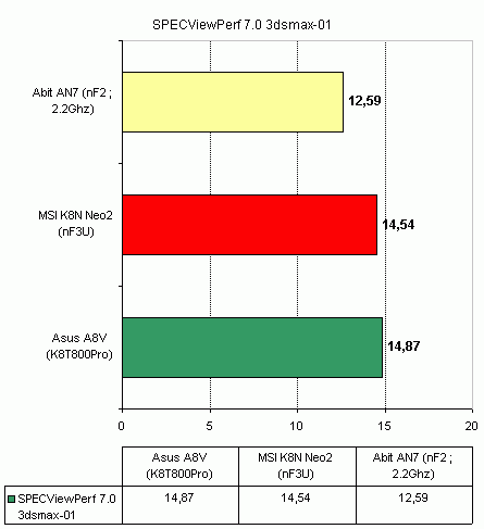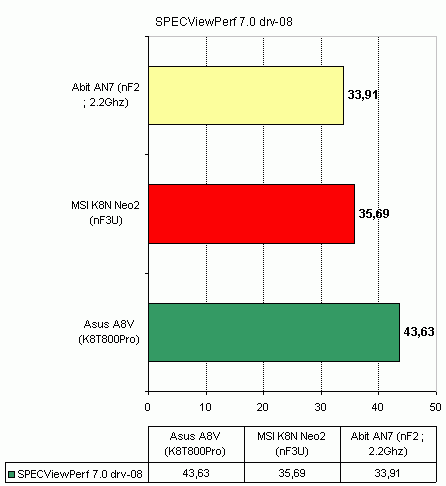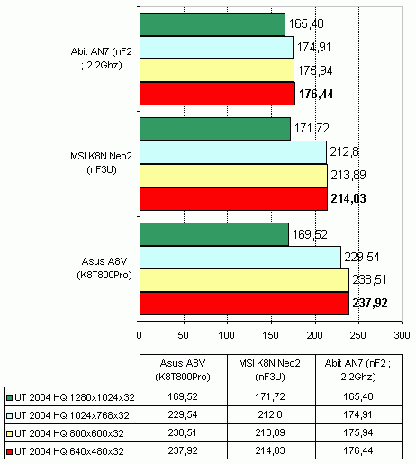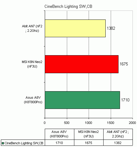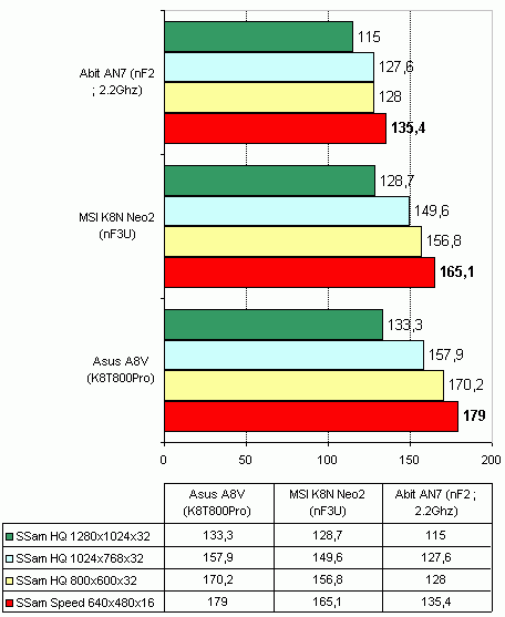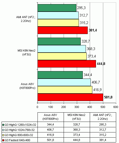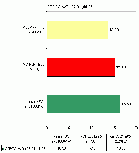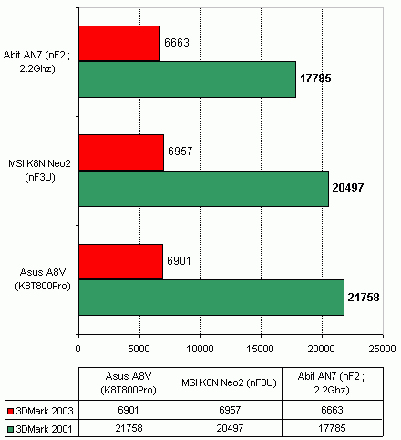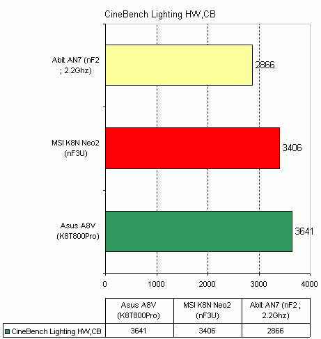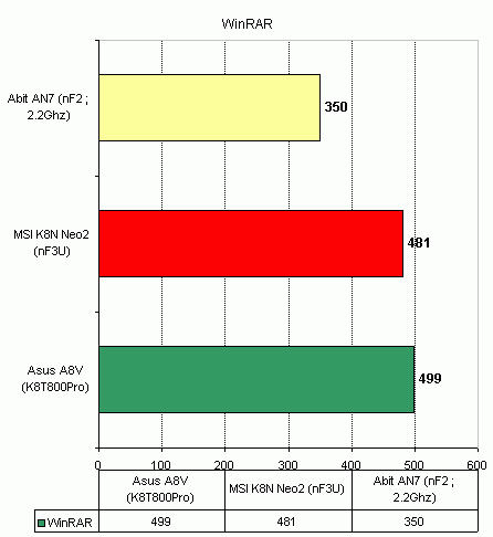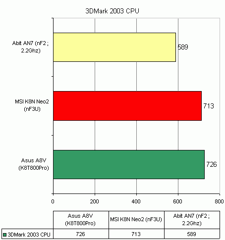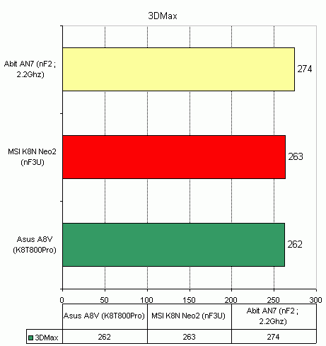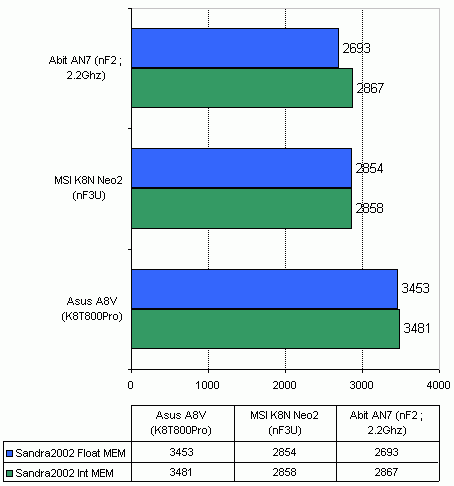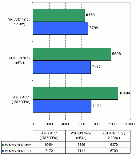 ПроизводительностьСравнение производительности мы будем проводить с платой MSI K8N Neo2, которая основана на чипсете nForce3 Ultra. К сожалению эта плата не смогла продемонстрировать весь скоростной потенциал чипсета nForce3. Дело в том, что из-за проблем с совместимостью с памятью, K8N Neo2 заработала в двухканальном режиме только с модулями OCZ PC3200, которые имеют весьма высокие тайминги (2.5-3-7-3). А плата Asus A8V работала с памятью Corsair PC3200 TwinX, которая имеет тайминги 2-2-6-2. Кроме того, в сравнении производительности будет участвовать система с процессором AMD Athlon XP3200+ (SocketA). В качестве материнской платы используется модель Abit AN7. В тестовой системе было использовано следующее оборудование: