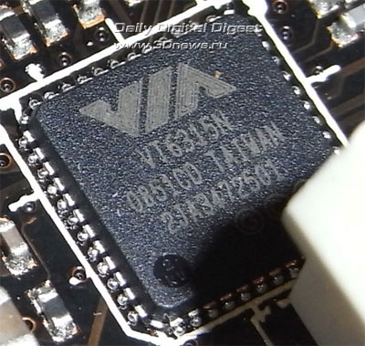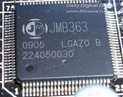 Кроме того, плата поддерживает один канал ParallelATA с помощью контроллера JMB363 производства JMicron. Этот же контроллер обеспечивает поддержку еще пары каналов SerialATA, один из которых выведен на заднюю панель платы, а другой расположен около "южного моста".