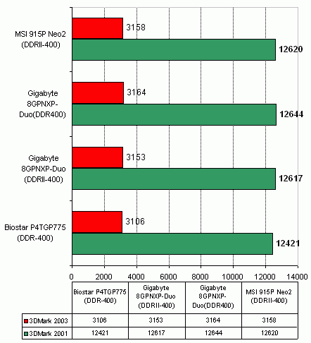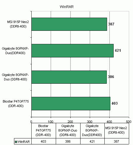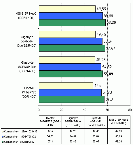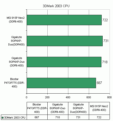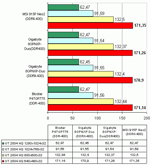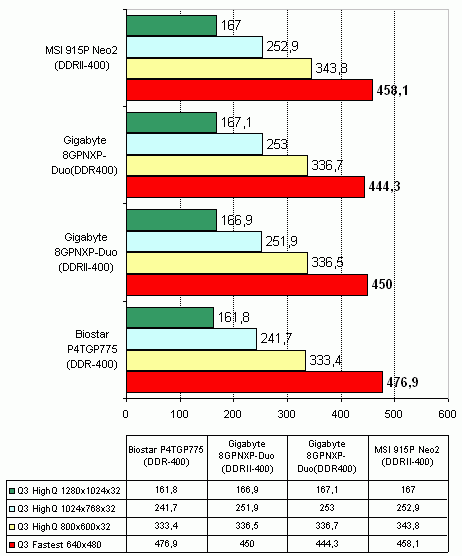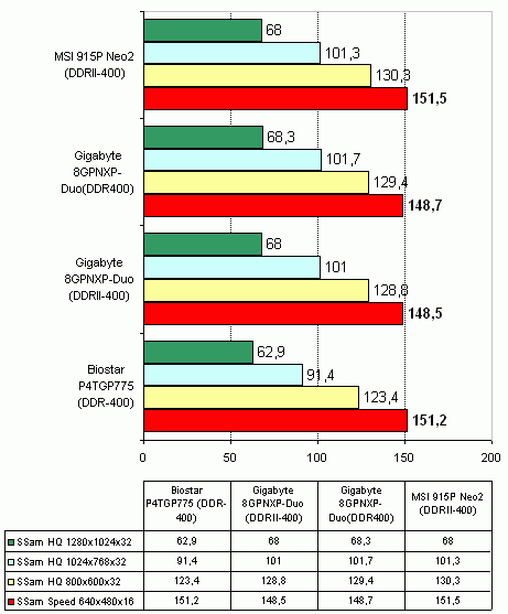 Как мы видим, даже значительное завышение частоты FSB (на 5 Мгерц, которое приводит к увеличению тактовой частоты процессора на 80Мгерц) позволяет плате Biostar P4TGP775 только сравняться в скорости с другими платами на i915P (за исключением теста Quake3).
