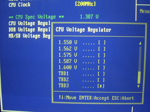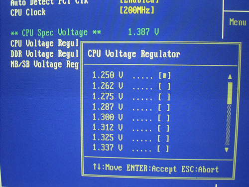 Во-вторых, плата Biostar P4TGP775 позволяет изменять напряжение на процессоре(Vcore) в диапазоне: от 1.25V (штатное = 1.3875V) до 1.6V с шагом 0.02-0.03V.