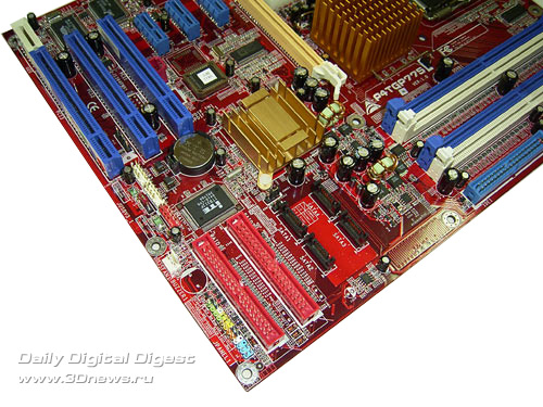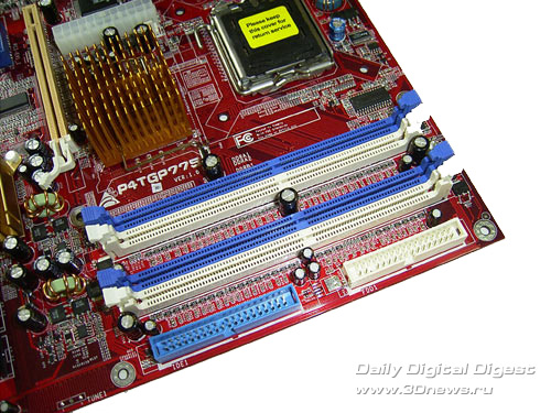 Под северным мостом установлено четыре 184-пиновых слота DIMM для модулей памяти DDR-I. Они разбиты они на две группы по два слота. Первые два слота относятся к первому каналу контроллера, последние два - ко второму каналу.