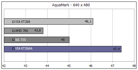 А вот в AquaMark всё не так блестяще. Отрыв максимум на 4 FPS, однако учитывая, что акселератор и настройки системы оставались прежними, можно сказать что KT266A нас однозначно поразил.