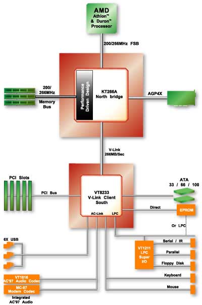 Сразу оговоримся, компания VIA Technologies позиционирует свой чипсет KT266A не как ревизию KT266, а как самостоятельный продукт. Но если, например, у Apollo Pro133A буква "A" в конце означала поддержку AGP 4x, у KT133A - 133 МГц системную шину, то в KT266A спецификация чипсета полностью совпадает с KT266. Отличие заключается в переделке одного из основных блоков северного моста - контроллера памяти.