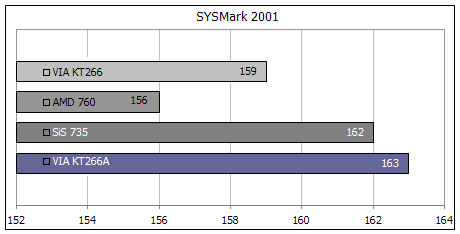 На этом графике отлично видно истинное преимущество чипсета КТ266А перед конкурентами. Преимущество в 30% преимущество перед SiS 735 и почти 80% преимущество перед КТ266.