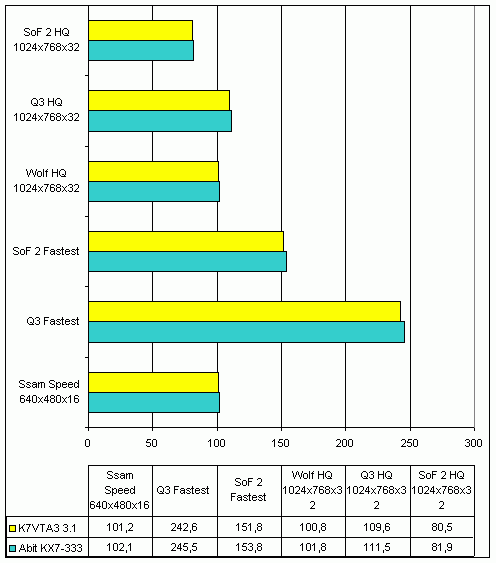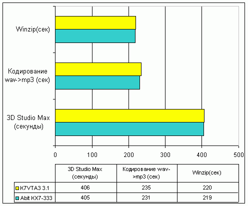 Во-первых, посмотрим на синтетические тесты, которые показывают теоретическую производительность. ![]() Далее - результаты тестов офисных приложений. ![]() И, наконец, игровые приложения. ![]() Плата показала типичный для KT333 уровень производительности. По всем тестам есть небольшое отставание от очень быстрой Abit KX7-333, но при работе/играх оно будет совершенно незаметным. ВыводыИтак, Elitegroup K7VTA3 ver3.1 представляет собой хорошую плату низшего ценового диапазона. Хорошая стабильность, отличная производительность (на уровне более дорогих плат) и все это за весьма и весьма небольшие деньги (~2300руб, сентябрь 2002). Список возможностей платы конечно невелик, но более требовательные пользователи могут поискать вариант платы с установленными RAID, USB2.0 и LAN контроллерами. Есть у платы и недостатки - это прежде всего отсутствие каких-либо средств для разгона процессоров. В результате плату нельзя посоветовать компьютерному энтузиасту. С другой стороны на штатных частотах плата показывает очень высокую производительность. ЗаключениеПлюсы: