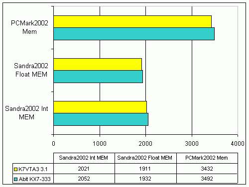 Разгон и стабильностьФункций разгона на плате практически нет. Есть только возможность изменить частоту системной шины. Это можно сделать либо перемычкой (100 или 133Мгерц), либо из биоса. В последнем случае доступен более широкий набор значений: 100, 110, 120, 133, 140, 150 и 166MHz. ![]() И все - никаких функций по поднятию напряжения нет. Так же нет возможности изменить множитель процессора. Теперь посмотрим, как плата поведет себя на практике - максимальная частота FSB составила 150Мгерц для процессора Duron и 140 - для процессора AthlonXP. При этом оба процессора способны работать на частотах 166Мгерц и выше (с повышением напряжения). Однако, вполне возможно, что новые 0.13мкм процессоры AthlonXP, для которых частота шины 166Мгерц является штатной, будут способны работать на плате Elitegroup K7VTA3 3.1. Что касается стабильности, то по этому параметру к плате претензий не возникло. Упомяну, что в четырехканальном модуле питания платы использованы девять конденсаторов емкостью 3300uF каждый. ![]() ПроизводительностьСравнение производительности я производил с платой Abit KX7-333. В тестовой системе было использовано следующее оборудование: