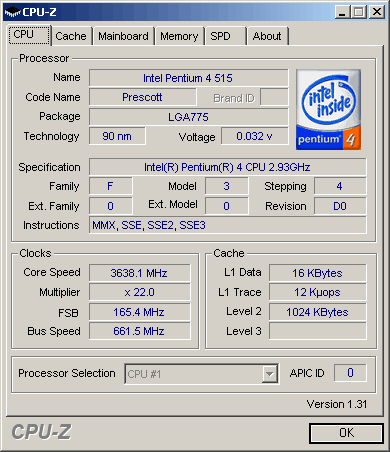 Практические испытания подтвердили наши предположения. Процессор Intel Pentium 4 515 с частотой 2,93 ГГц на плате Epox EP-5EDAI удалось разогнать до 3815 Мгц,