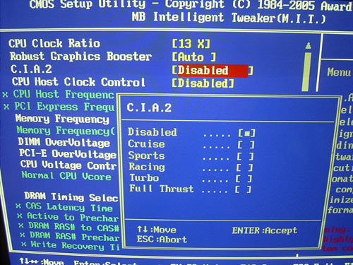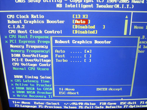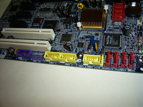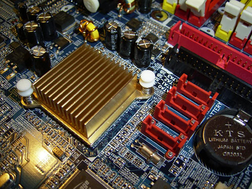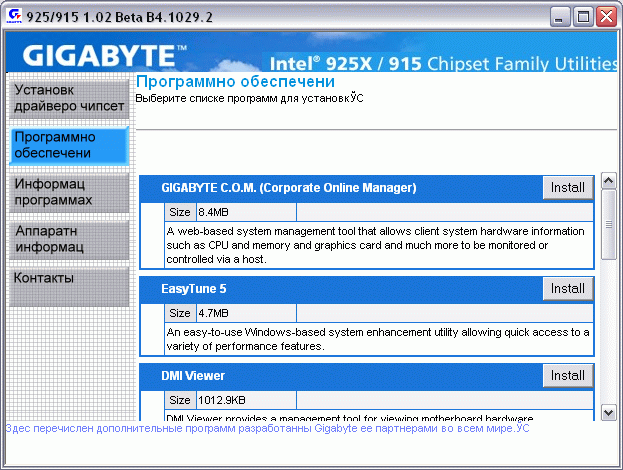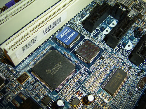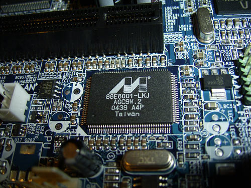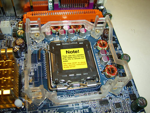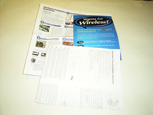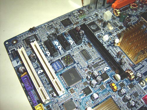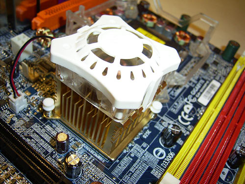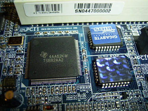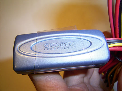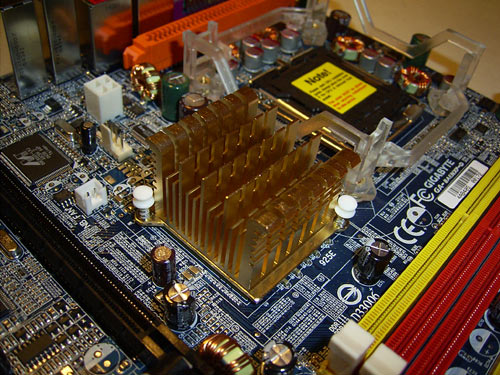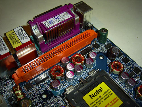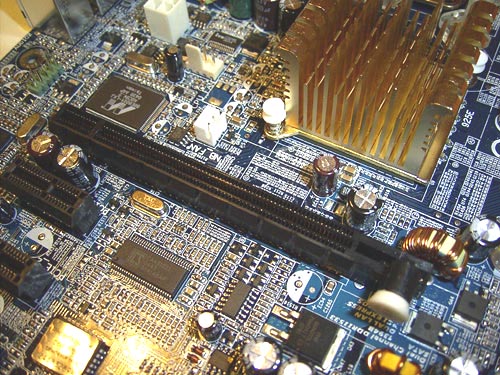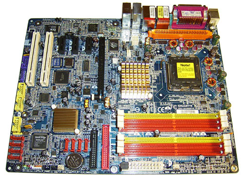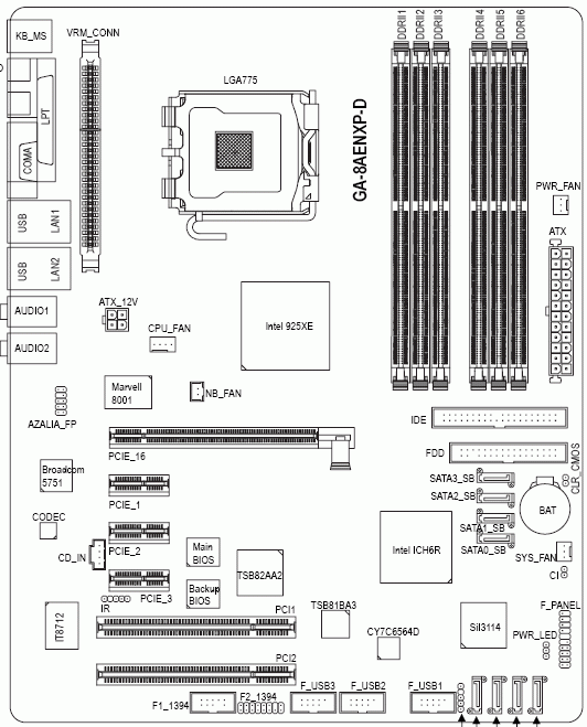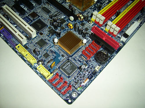 Так, для всех портов SerialATA есть соответствующие кабели и переходники питания. Тоже самое можно сказать про порты USB (их на плате 11!). А вот одного дополнительного порта firewire не хватает: плата поддерживает три порта, а на брекете их только два.  Остальная комплектация привычная: заглушка на корпус, один шлейф для дисковода и один шлейф для ParallelATA устройств. Напомню, что южный мост ICH6 поддерживает только один канал ParallelATA. В некоторых случаяхконфигурациях этого может быть недостаточно. И поэтому многие производители интегрируют дополнительный PATARAID контроллер (чаще всего это чип ITE8212F, как мы видели в сравнительном тестировании плат с сокетом LGA775). Однако в случае с платой 8AENXP-D разработчики решили не использовать доп. контроллер, а добавить в комплектацию переходник ParallelATA=>SerialATA:  Подобные устройства встречались нам в продуктах Abit (Serillel) и DFI.  Что касается документации, то она включает основное руководство пользователя, руководство по созданию и настройке RAID массивов,  краткое руководство по сборке системы, а также руководство по установке процессора.  На компакт-диске, помимо драйверов, есть дополнительное ПО - Norton Internet Security 2004. Кстати, сами драйвера устанавливаются при помощи очень удобной оболочки:  Во второй коробке мы можем найти вентилятор для северного моста, модуль питания U-Plus DPS,  а также плату беспроводной связи стандарта WiFi:  Платка имеет антенну, и устанавливается в PCI слот. К ней прилагается отдельный CD с драйверами и ПО, и брошюра по настройке. Вывод: за комплектацию мы спокойно можем поставить оценку "5". Для более высокой оценки (5+) плате потребовался бы брекет с одним портом Firewire, а также привычный атрибут плат Gigabyte (класс high-end) - модуль для подключения внешних SerialATA устройств. Плата Gigabyte 8AENXP-DЕдинственный недостаток дизайна платы заключается в возможном конфликте длинной PCI-Express видеокарты и ParallelATA шлейфа.  Других претензий нет - основной 24-пиновый разъем питания установлен на нижнем краю платы, а 4-пиновый дополнительный - около чипсета. Неиспользуемые коннекторы на основном разъеме заклеены бумажкой, поэтому подключение кабеля питания происходит без затруднений. Защелки слотов памяти находятся на большом расстоянии от слота PCI-Express, а 4-пиновый разъем питания процессорного кулера удобно расположен около чипсета.   установлена пластиковая рамка от кулера Gigabyte 3D Cooler Тут же (рядом с чипсетом) расположен двухпиновый коннектор NB_FAN, к которому можно подключить дополнительный вентилятор (который есть в комплекте). Иными словами, в штатных режимах можно ограничиться пассивным охлаждением чипсета,  а при разгоне подключить вентилятор (кстати, он имеет синюю подсветку).  Кроме CPU_FAN и NB_FAN, на плате установлено еще два разъема для вентиляторов: PWR_FAN около основного разъема питания и SYS_FAN - около батарейки. Отметим, что только разъем CPU_FAN поддерживается технологией Smart Fan, которая позволяет регулировать скорость вращения в зависимости от температуры. Под северным мостом установлено шесть(!) 240-пиновых слота DIMM для модулей памяти DDR2. Они разбиты они на две группы для облегчения установки модулей в двухканальный режим.  Кроме того, на плате установлен один слот PCI-Express x16 с фирменной защелкой, который предназначен для видеокарт.  Также на плате Gigabyte 8AENXP-D установлено три слота PCI-Express x1 и два "обычных" PCI-слотов.  Возможности расширенияНа плате Gigab