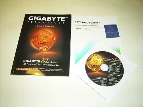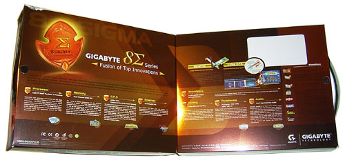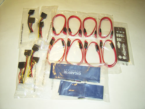КоробкаВ настоящее время все материнские платы Gigabyte класса high-end имеют двойную упаковку.  Это очень правильное решение, поскольку только две коробки в состоянии уместить все кабели, брекеты и документацию, которые поставляется вместе с платой.  Комплектация