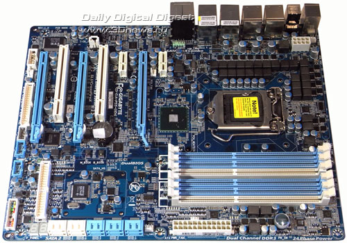 Обратите внимание, что инженеры Gigabyte использовали довольно необычную схему размещения чипсета Intel P55. Он находится между процессорным разъемом и первым PEG-слотом, тогда как на всех остальных протестированных нами платах он находится в левом нижнем углу (или на месте "южного моста" на платах P45).