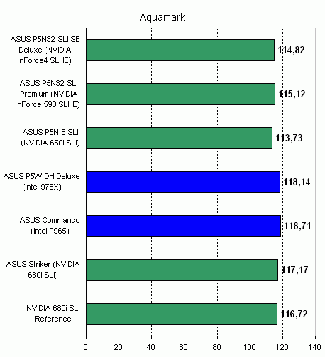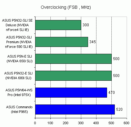 Как мы видим, лидирующая позиция за чипсетом Intel P965, однако последнее поколение чипсетов NVIDIA nForce 6xxi достаточно близко приблизилось, преодолело рубеж 500МГц, и обогнало Intel 975X. Впрочем, перед нами результаты только нашей тестовой лаборатории. А между тем, в сети достаточно много более высоких результатов, причем некоторые из них достигнуты с помощью нестандартных систем охлаждения и вольтмодов.