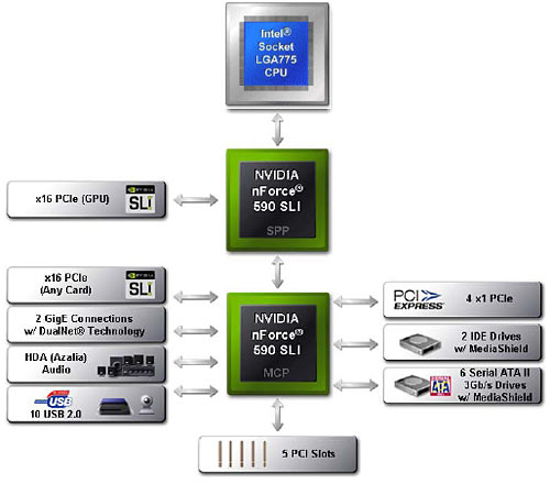 Чипсет nForce 590 SLI предназначен для high-end систем, в которых необходимо получение максимального эффекта от SLI. Чипсет позволяет выделить на каждую видеокарту по 16 линий шины PCI Express (чипсет поддерживает всего 48 линий шины). Техническая реализация потребовала от инженеров NVIDIA установки второго чипа. Но с таким решением мы уже сталкивались при рассмотрении чипсета nForce4 SLI X16. nForce 590 SLI служит заменой этого чипсета.